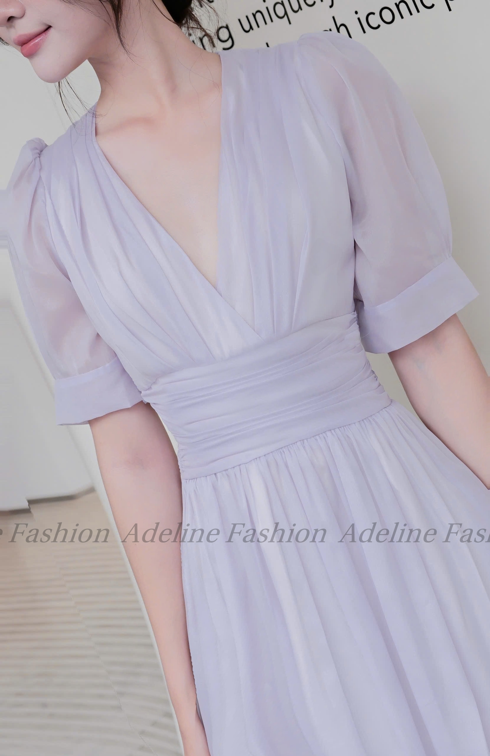 Váy dài cổ V tay bồng eo nhún thanh lịch màu tím nhạt pastel