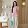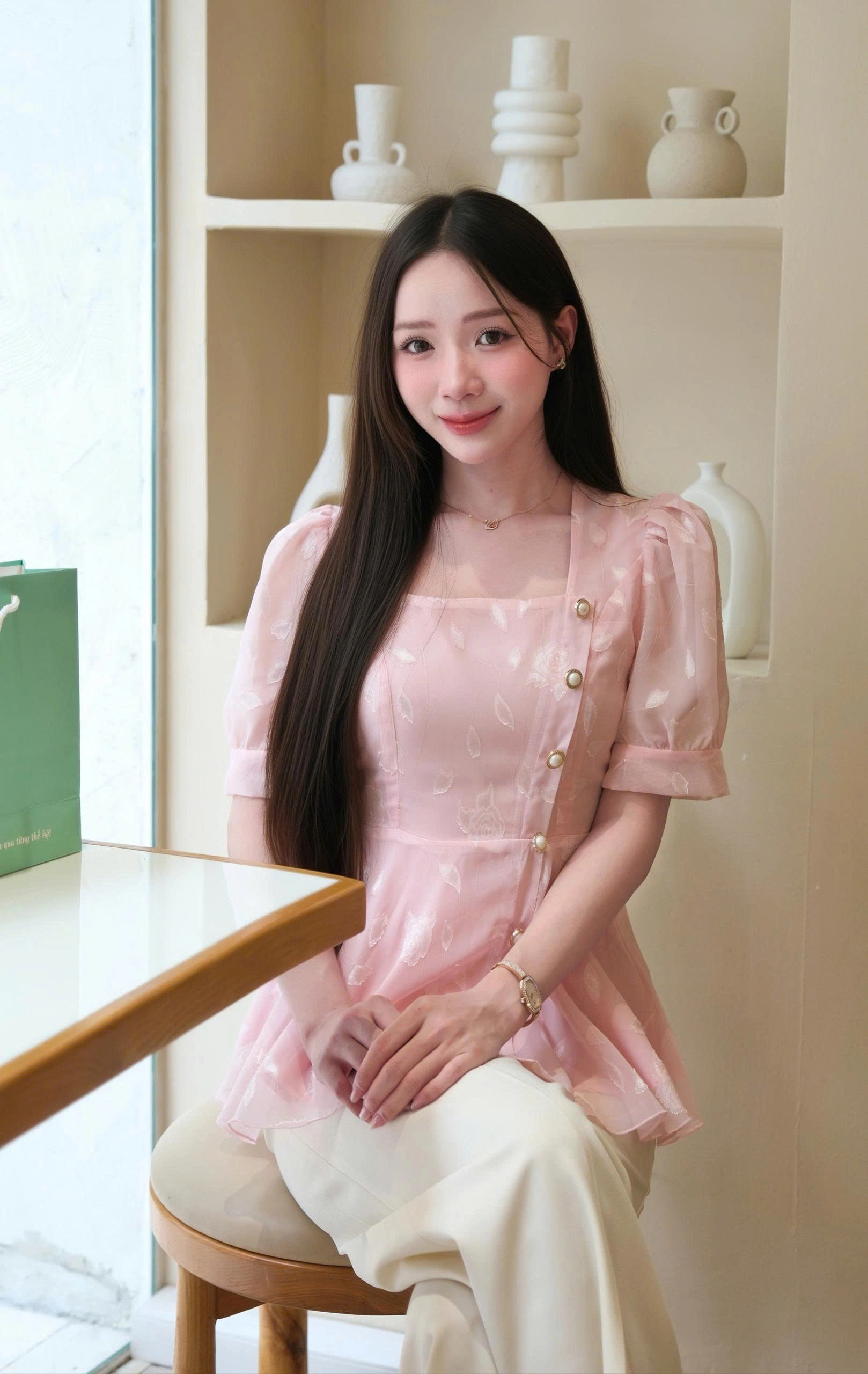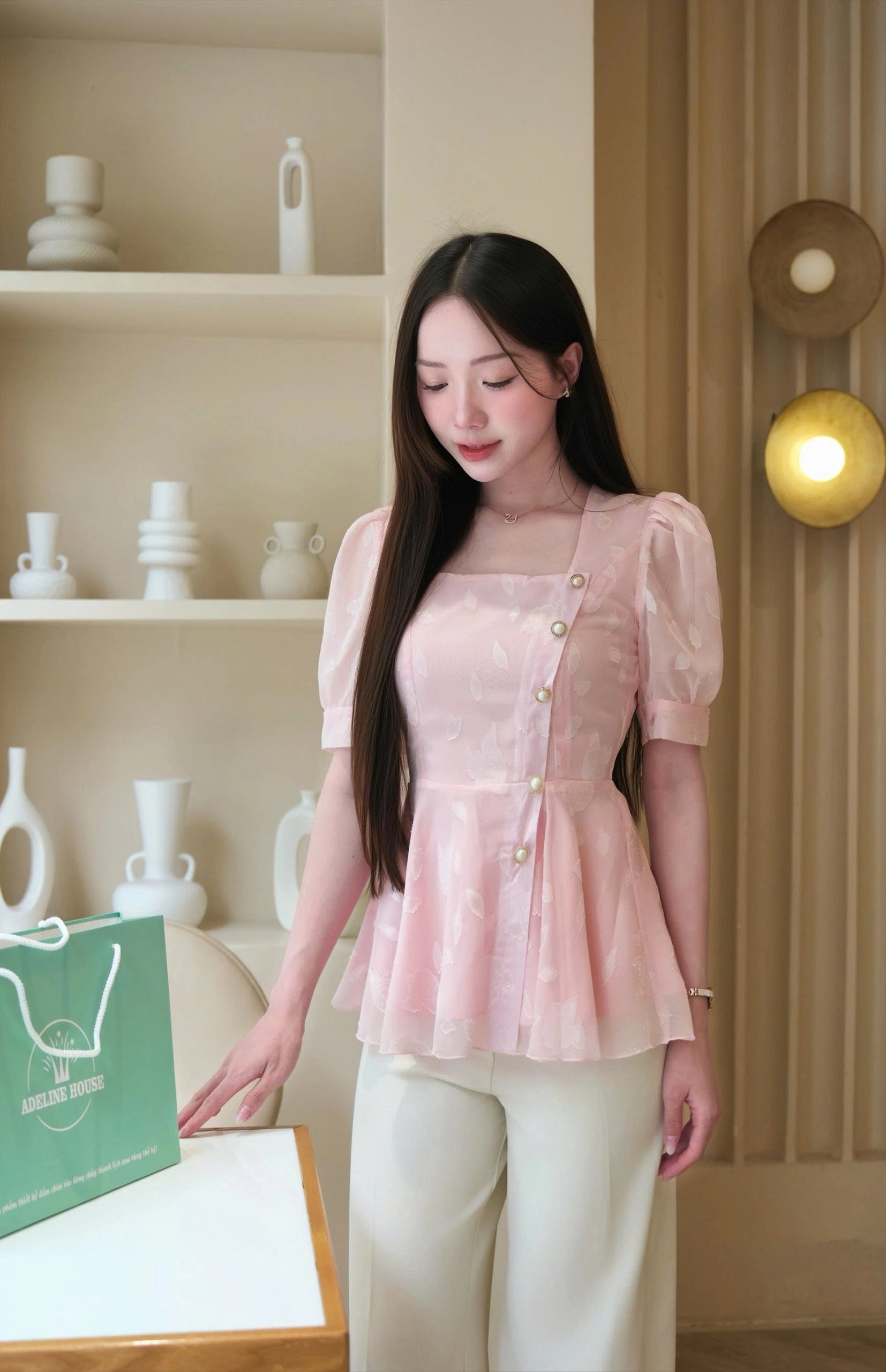 Tên: Áo cổ vuông tay bồng hồng thêu lá