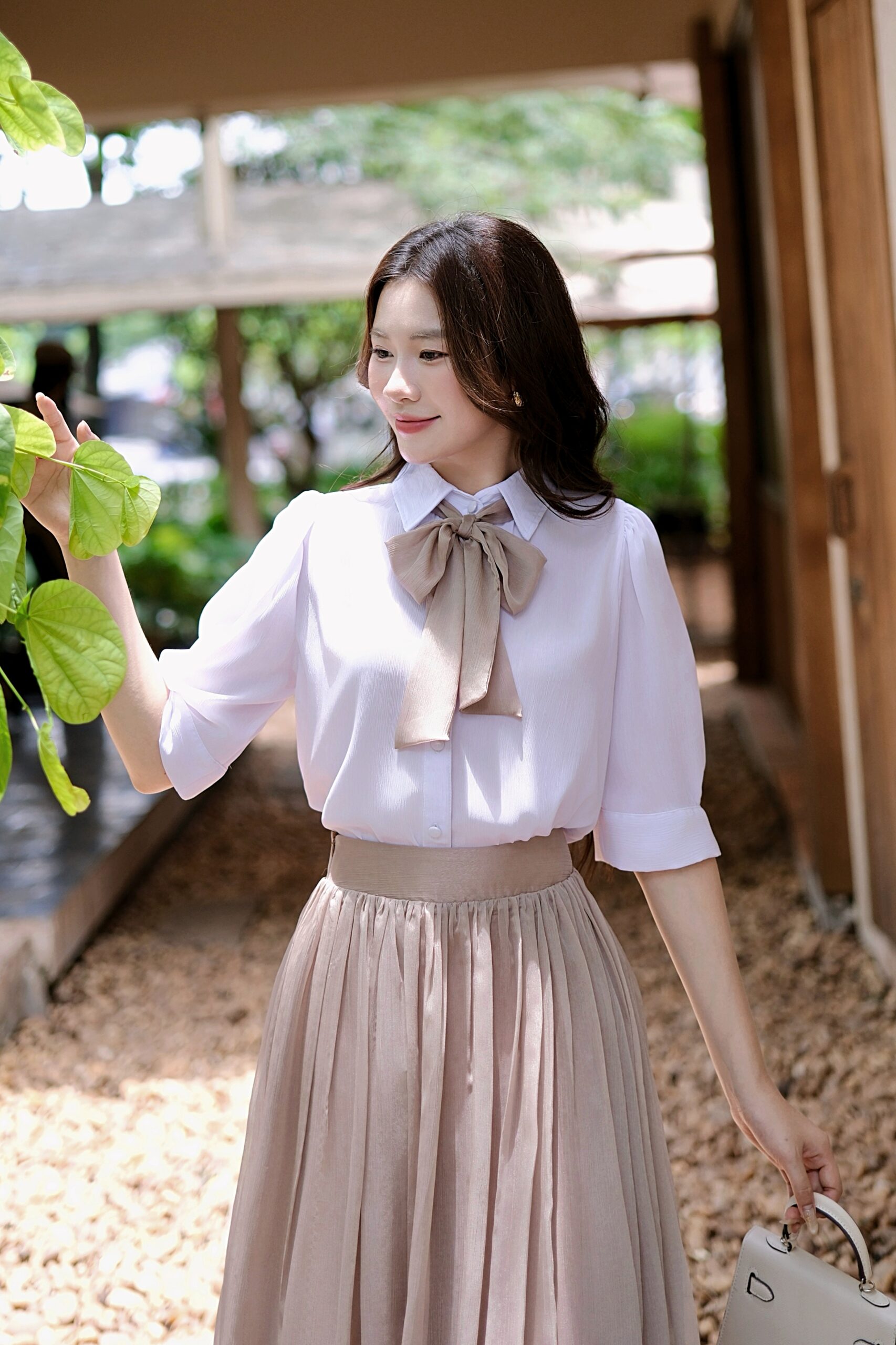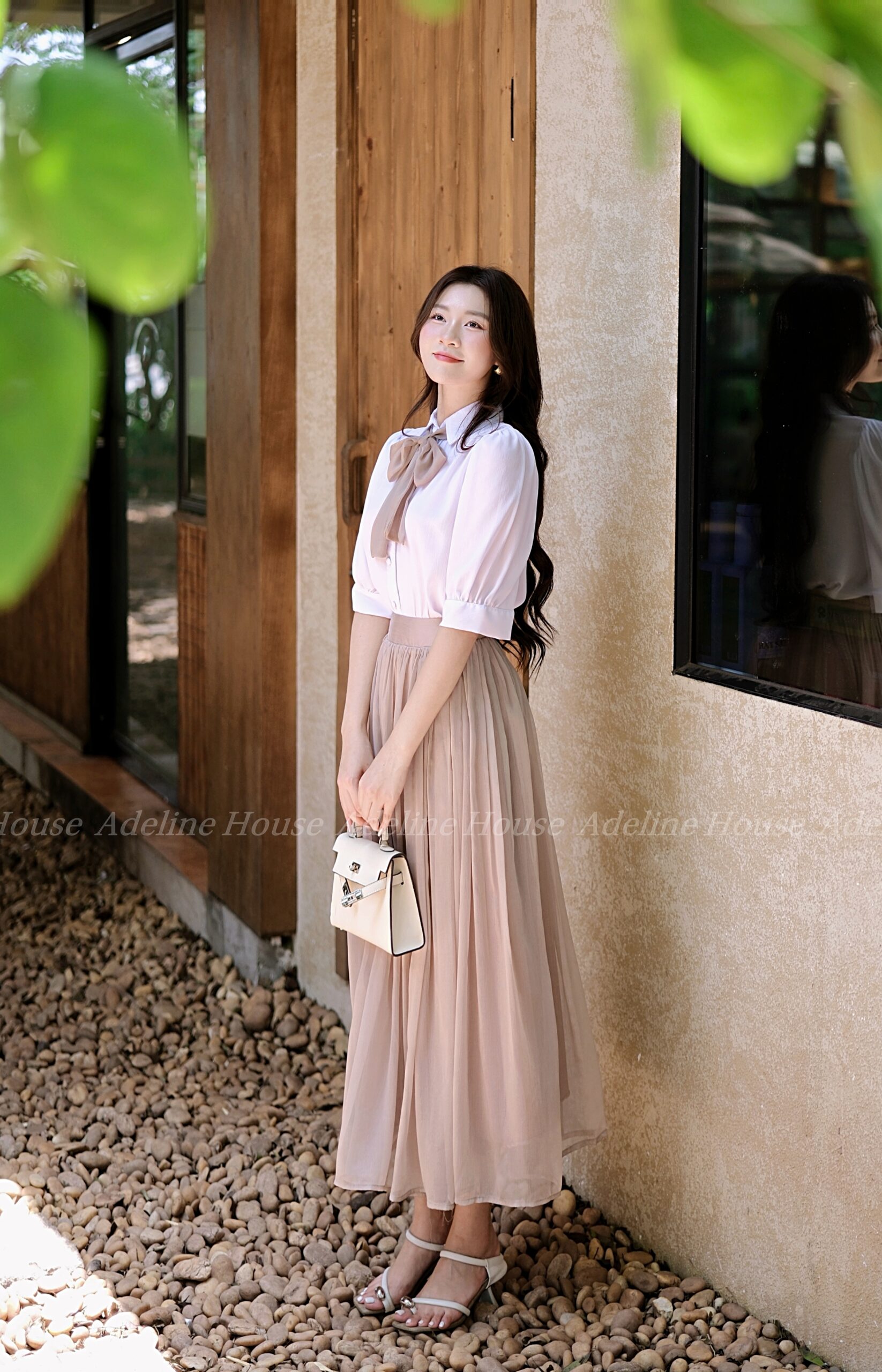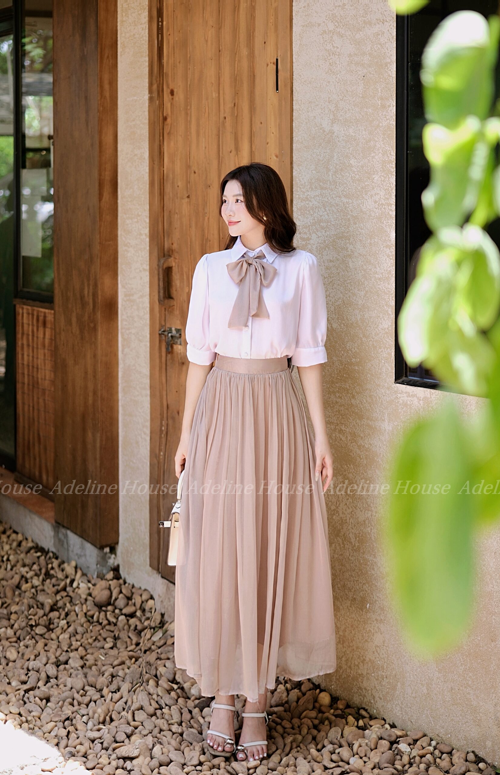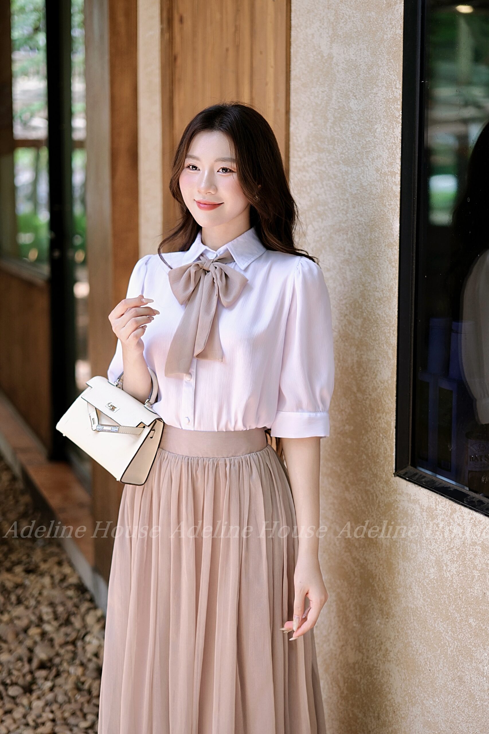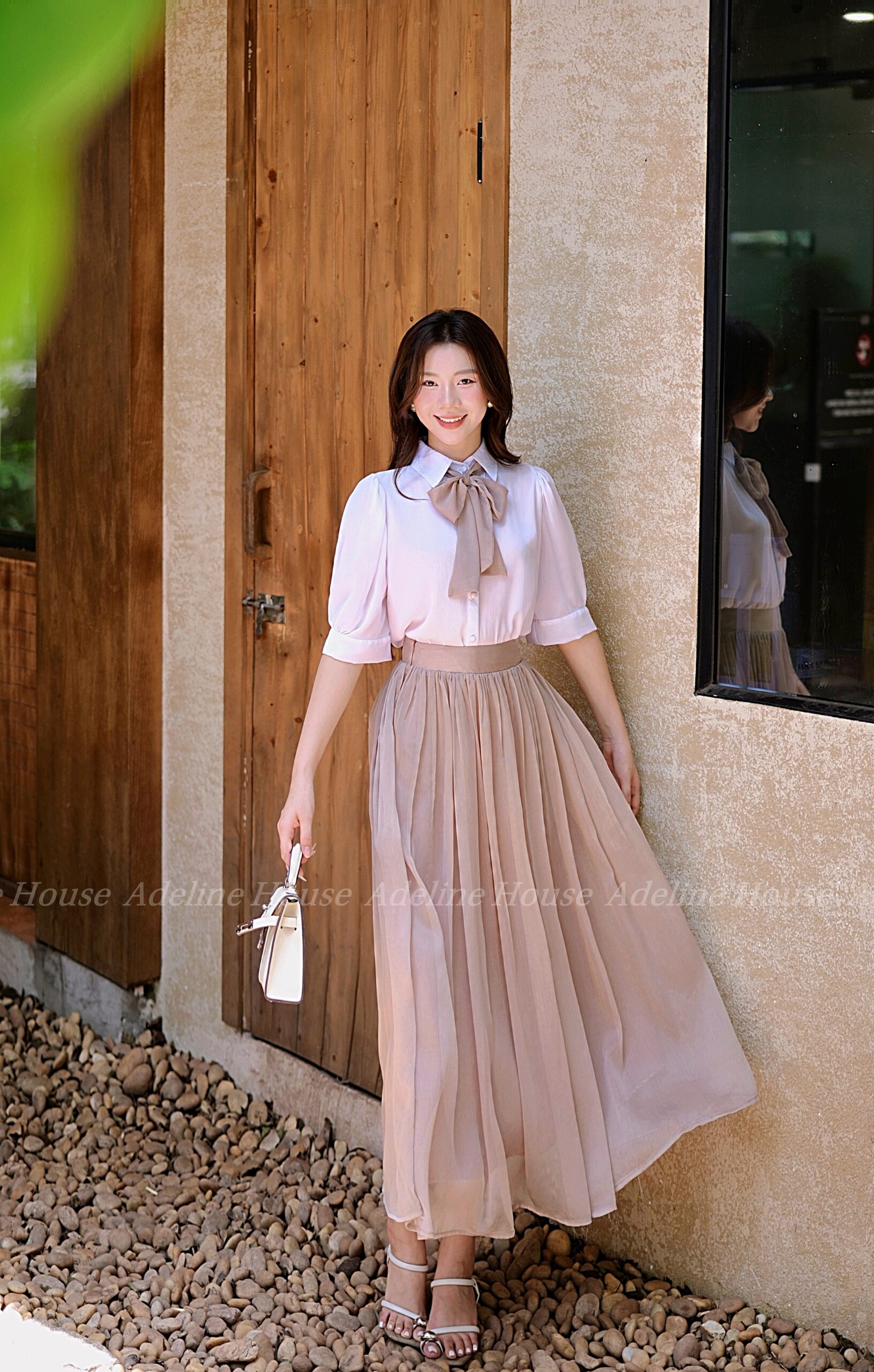 Adeline House – Set Tiểu Thư Áo Sơ Mi Nơ Cổ Chân Váy Midi Xếp Ly!